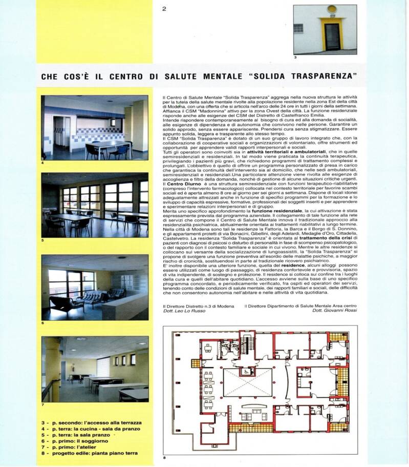 Si tratta di una nuova struttura per pazienti del Servizio di Salute Mentale, collocata in un quartiere residenziale di Modena, realizzata ed avviata alla fine degli anni novanta. E’ articolata su tre piani, per offrire spazi dedicati alle diverse funzioni di Centro diurno e laboratori (al piano terra), ambulatori e atelier per attività ricreative (al piano primo) e Residenza al piano secondo.